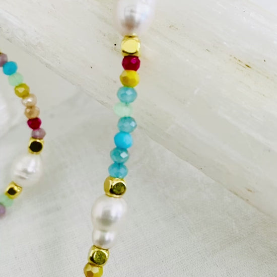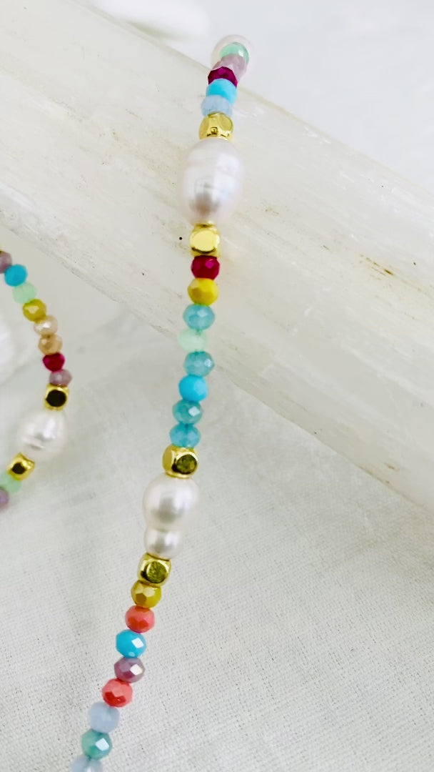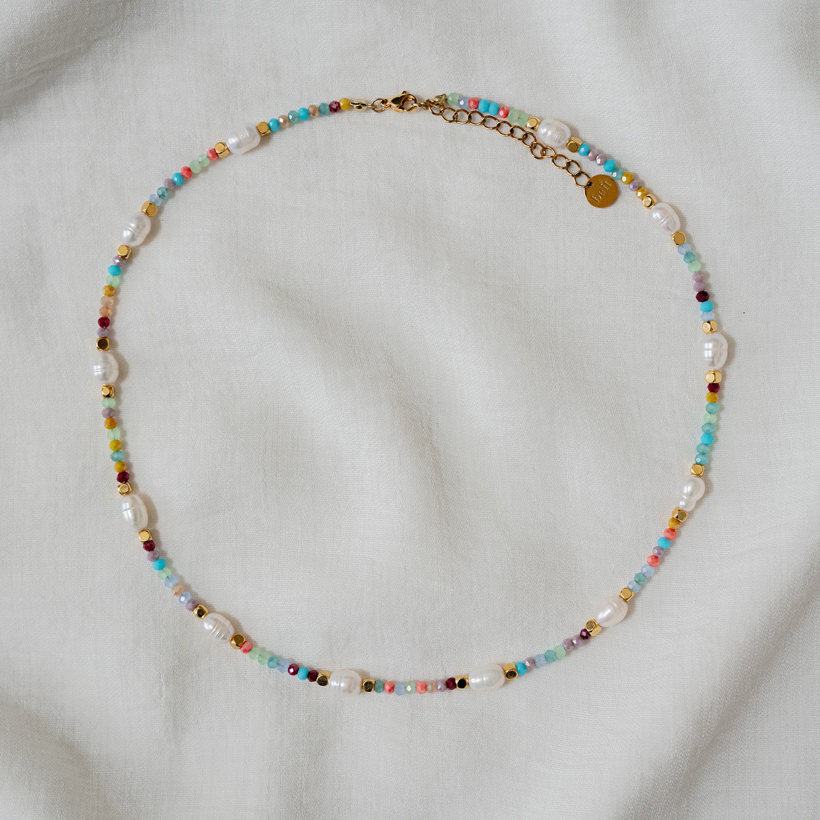 Dainty Gold Layering Necklace: Beaded Pearl & Bright Color Glass - Minimalist Boho