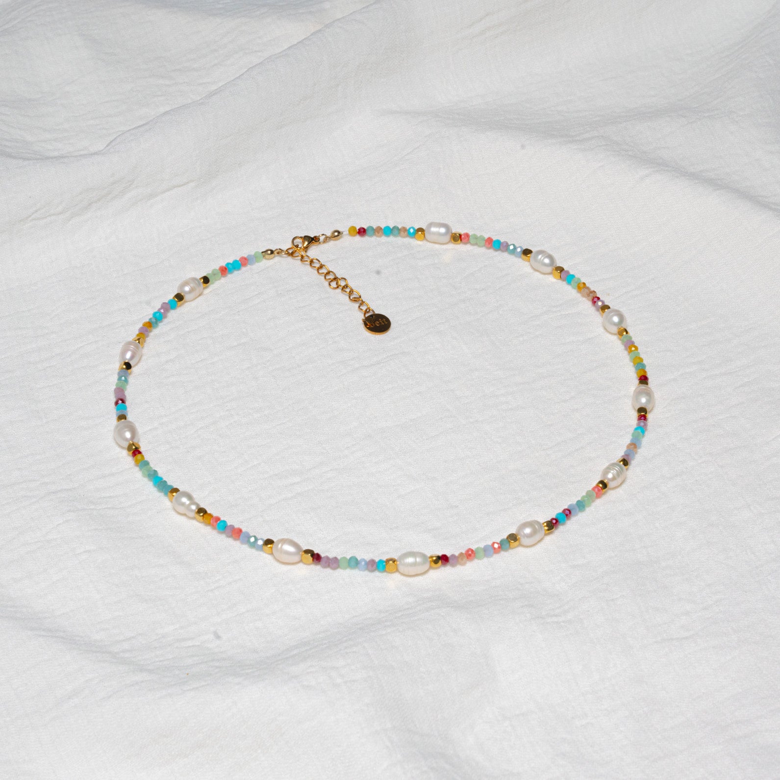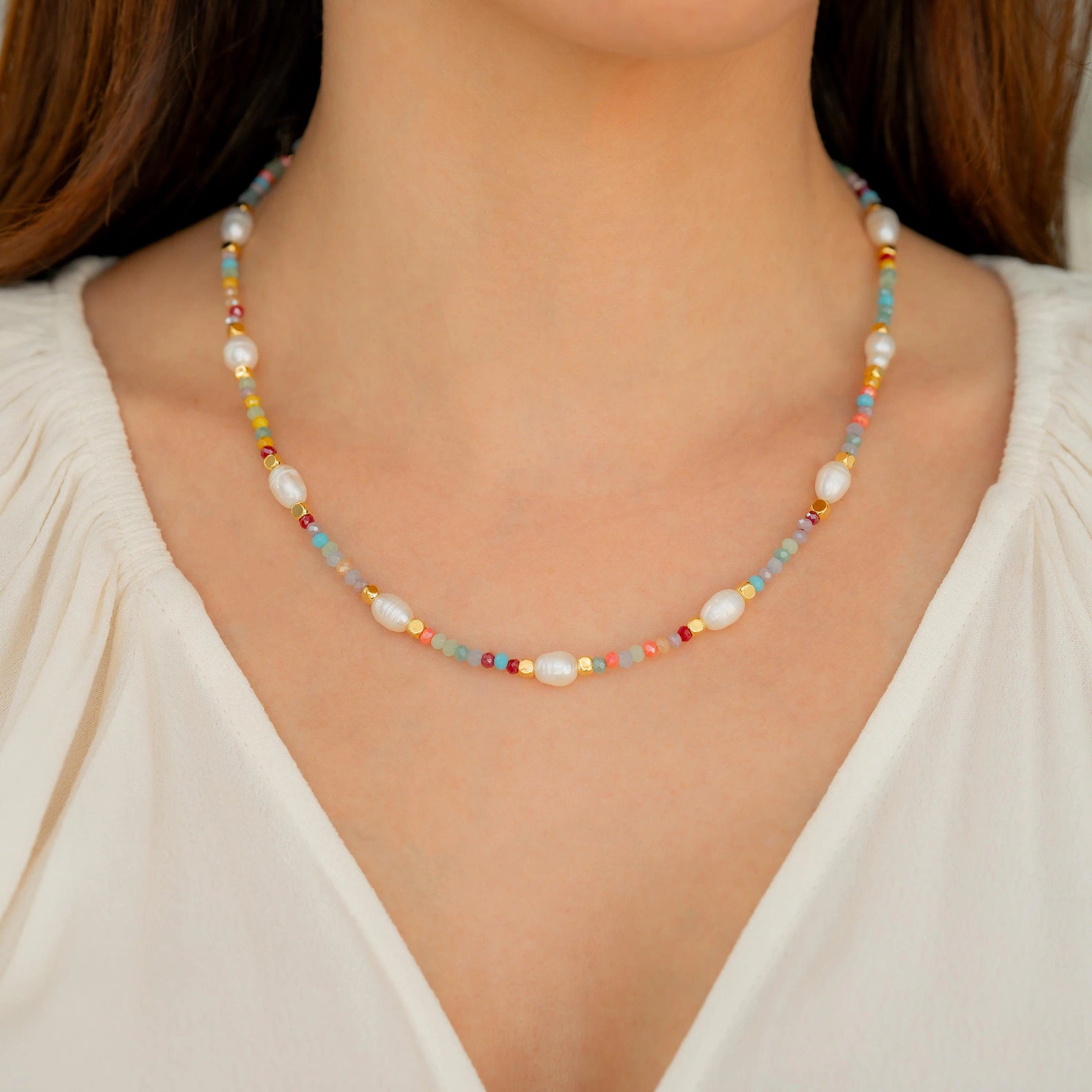Get ready to turn heads with the Color Bead Pearl Necklace. This timeless and luxurious piece is crafted with a combination of freshwater pearls and premium glass beads set in gold plated stainless steel. Its adjustable length makes it the perfect accessory for any outfit, while its water -resistant design makes it ideal for beach or pool days. Whether you're looking to make a statement or add a subtle touch of elegance, the Dainty Gold Layering Necklace: Beaded Pearl & Bright Color Glass - Minimalist Boho will be your go-to this summer.