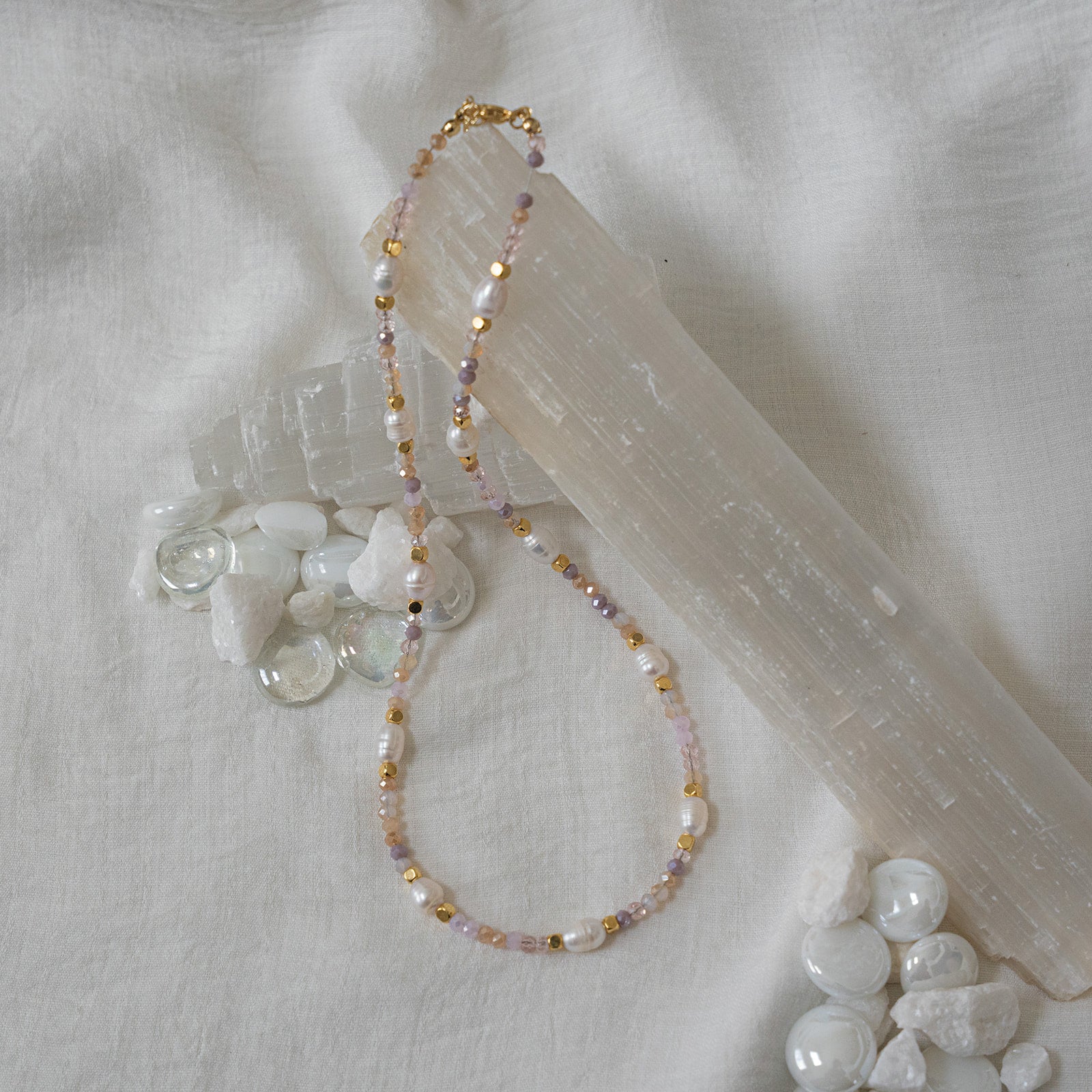 Dainty Gold Layering Necklace: Beaded Pearl & Light Color Glass - Minimalist Boho
