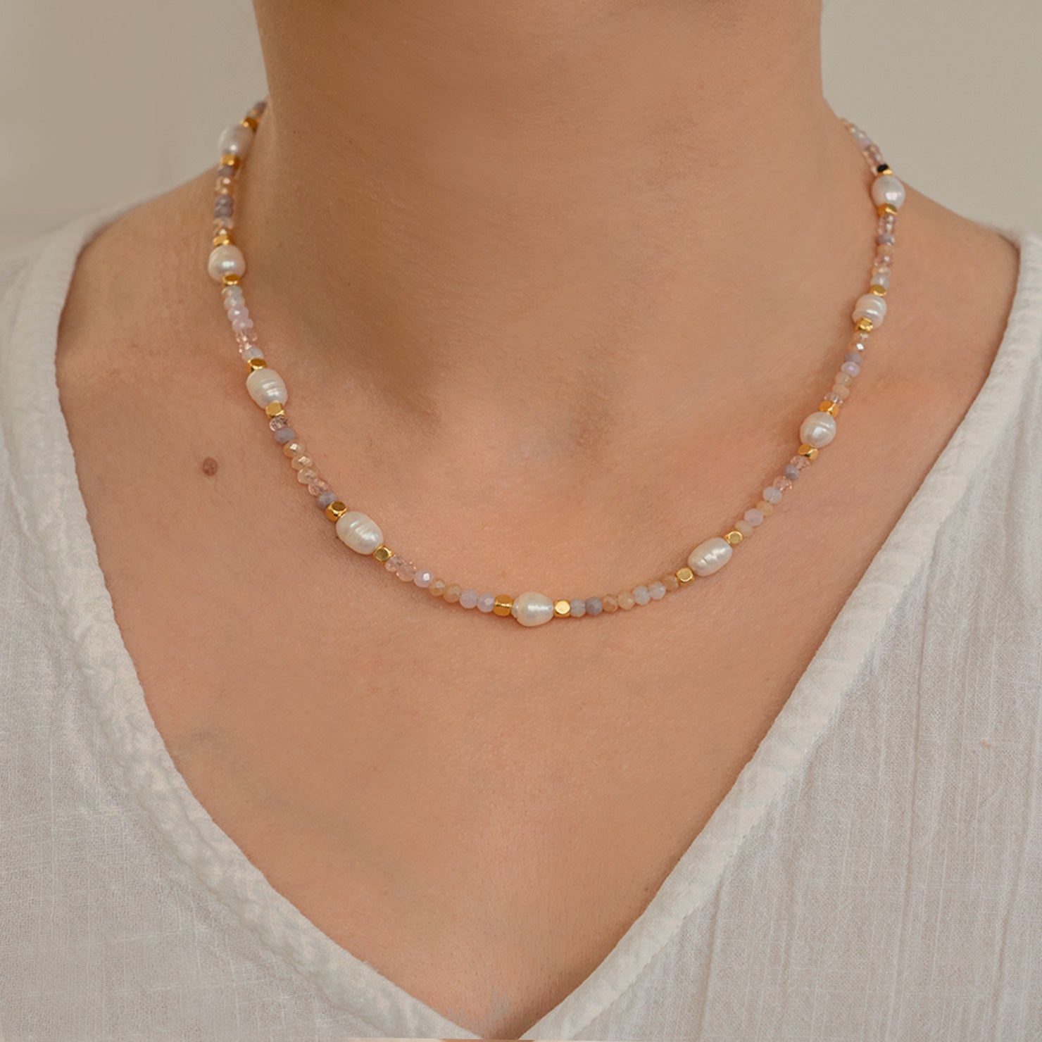 Get ready to turn heads with the Color Bead Pearl Necklace. This timeless and luxurious piece is crafted with a combination of freshwater pearls and premium glass beads set in gold plated stainless steel. Its adjustable length makes it the perfect accessory for any outfit, while its water -resistant design makes it ideal for beach or pool days. Whether you're looking to make a statement or add a subtle touch of elegance, the Dainty Gold Layering Necklace: Beaded Pearl & Light Color Glass - Minimalist Boho will be your go-to this summer.